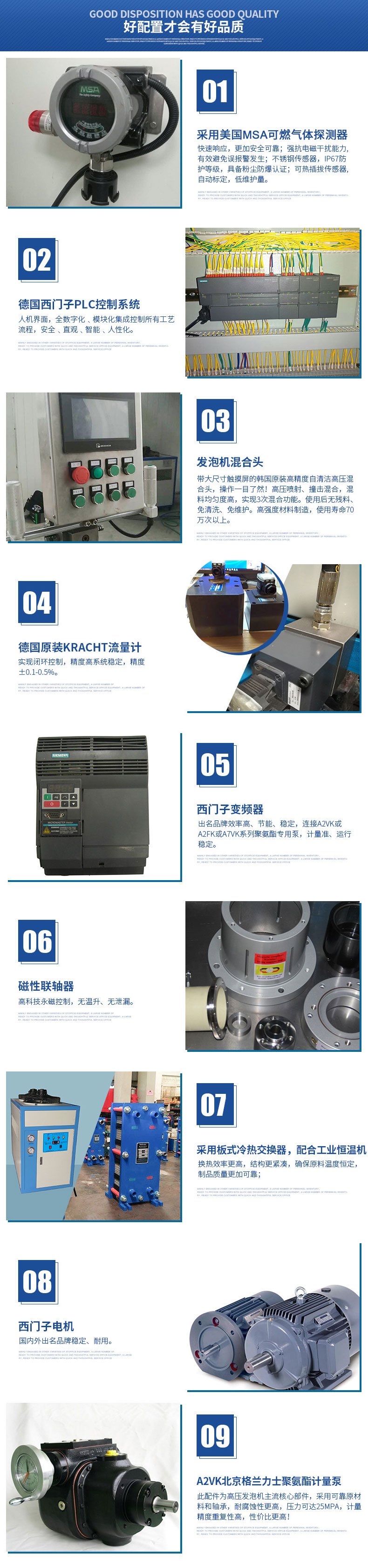 具有西門子PLC+雙變頻多功能安全裝置,38個智能自檢保護點,獨立防靜電房,烷氣濃度等級自動識別系統(tǒng),自動2-3級抽風(fēng)系統(tǒng),西門子防爆電機,獨立導(dǎo)地裝置,槍頭引線靜電導(dǎo)出裝置等,外接2組獨立對比恒溫,12~100種噴灌定時定量控制,開槍溫度鎖定,故障自檢報警等,本系統(tǒng)采用自清潔/止逆/防濺粘/新型V型發(fā)泡槍(實現(xiàn)3次混合功能),結(jié)構(gòu)美觀、操作方便。根據(jù)客戶實際情況,還可以一機雙槍使用,雙槍自動切換,變頻節(jié)能、應(yīng)用自如,專為客戶量身訂做發(fā)泡完善系統(tǒng)。